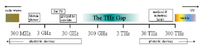 The terahertz spectrum lies between long infrared and microwave frequencies.